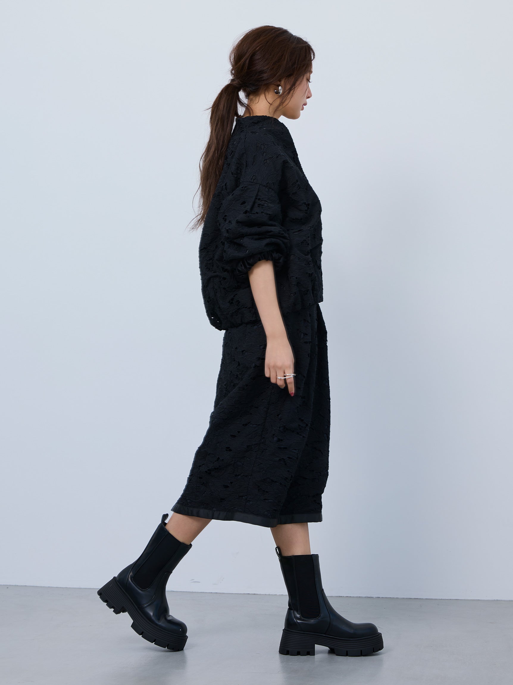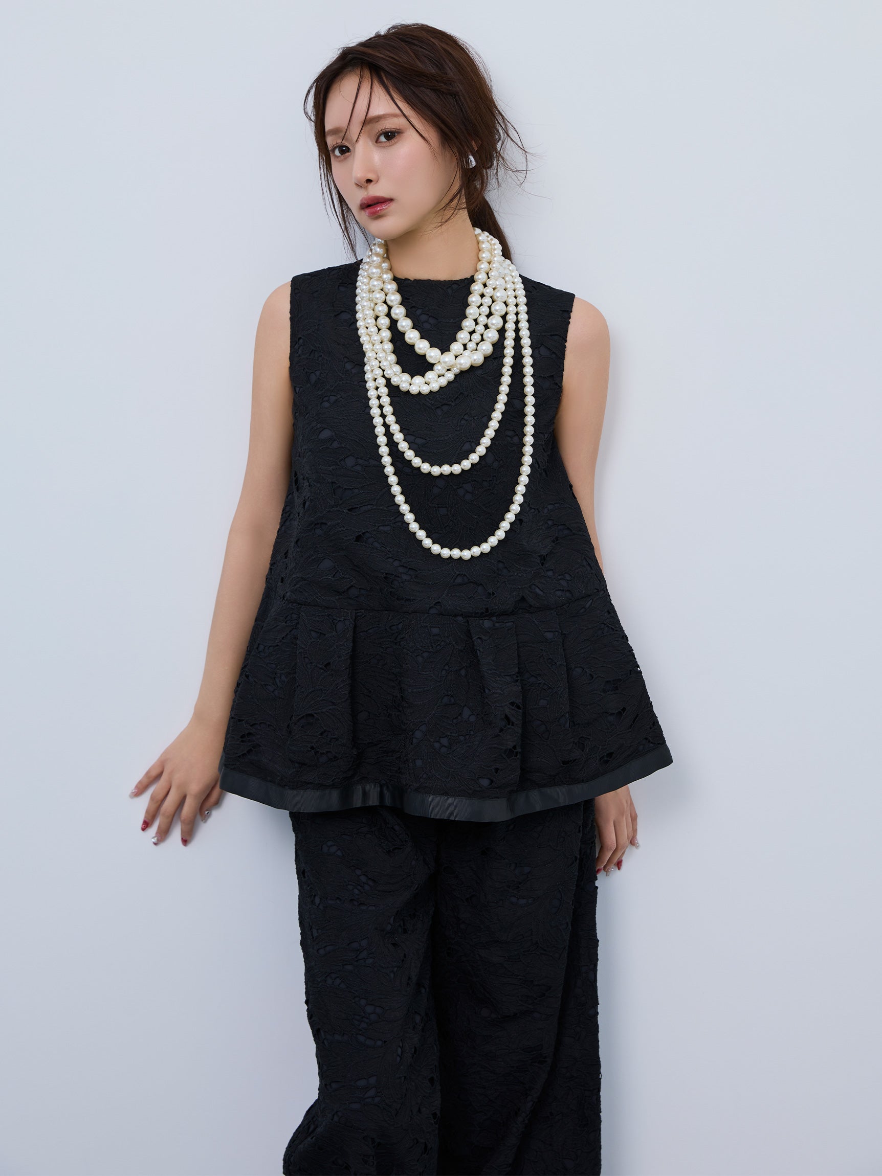 コンサバティブになりすぎないよう、大胆なレース使いながらもややコクーンのような丸みを帯びたシルエットでルーズなフォルムに仕立てました。