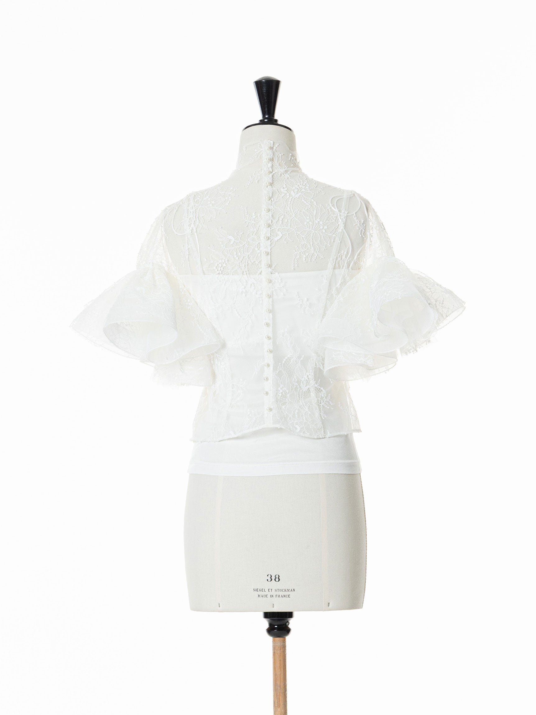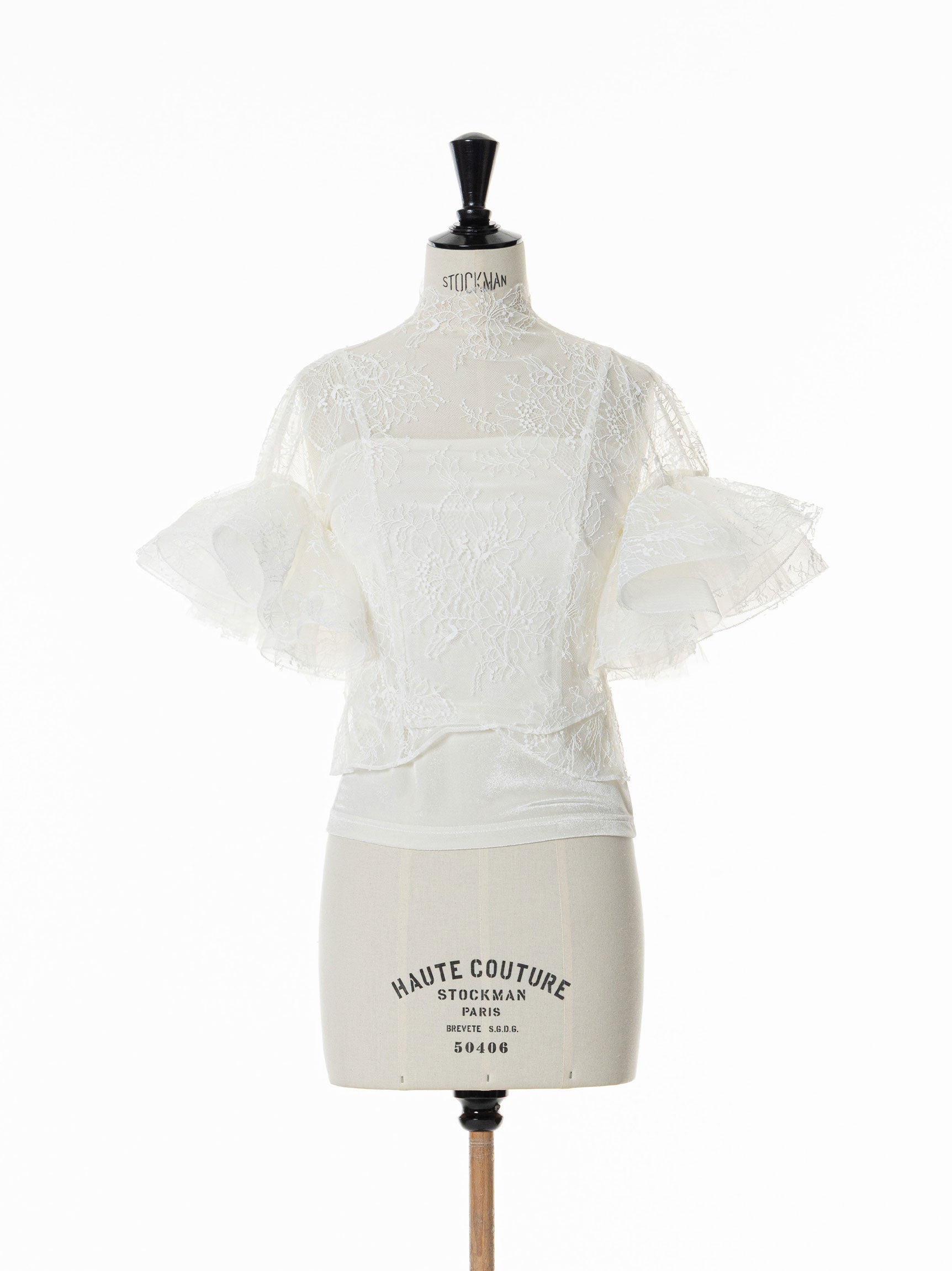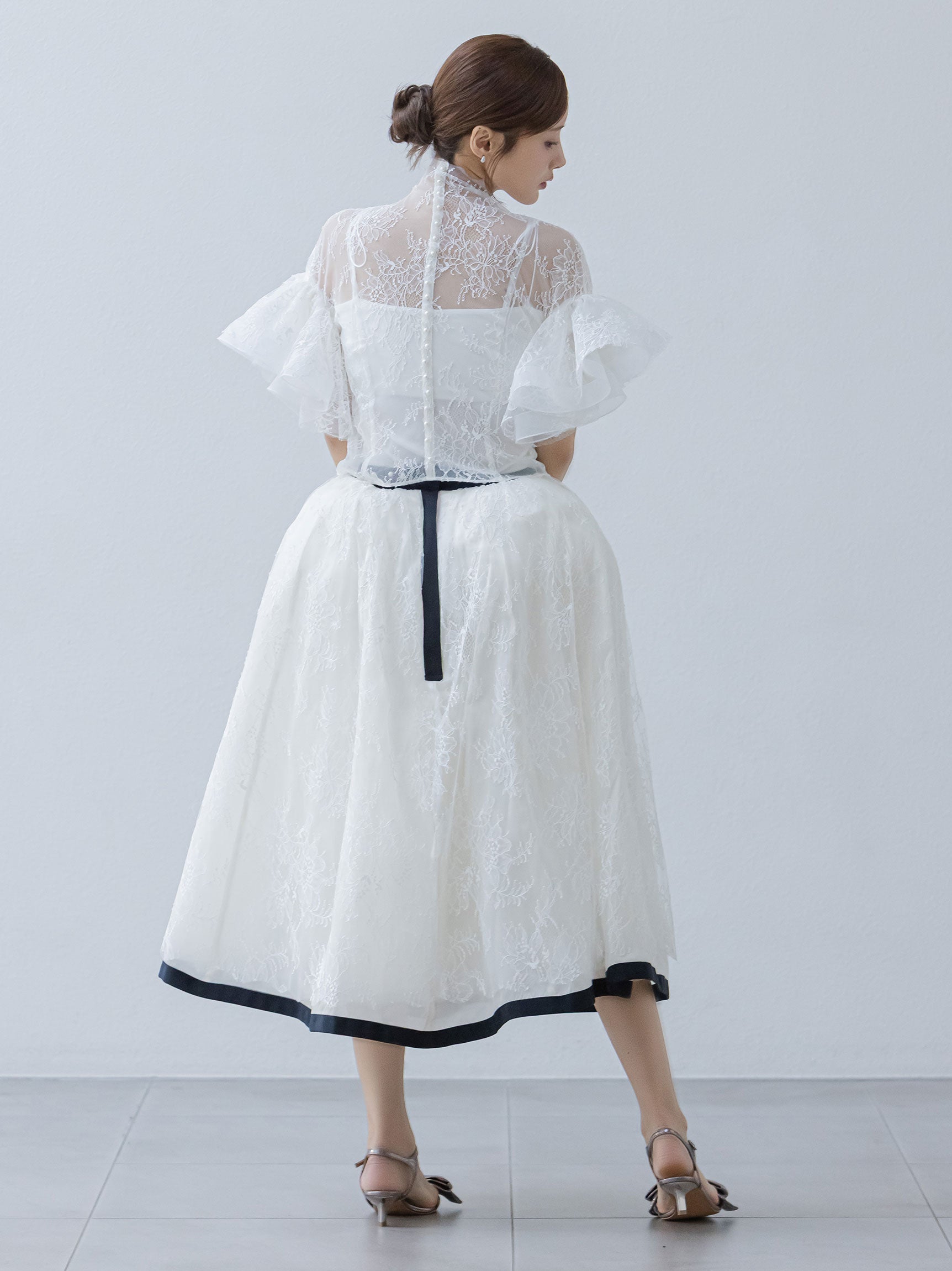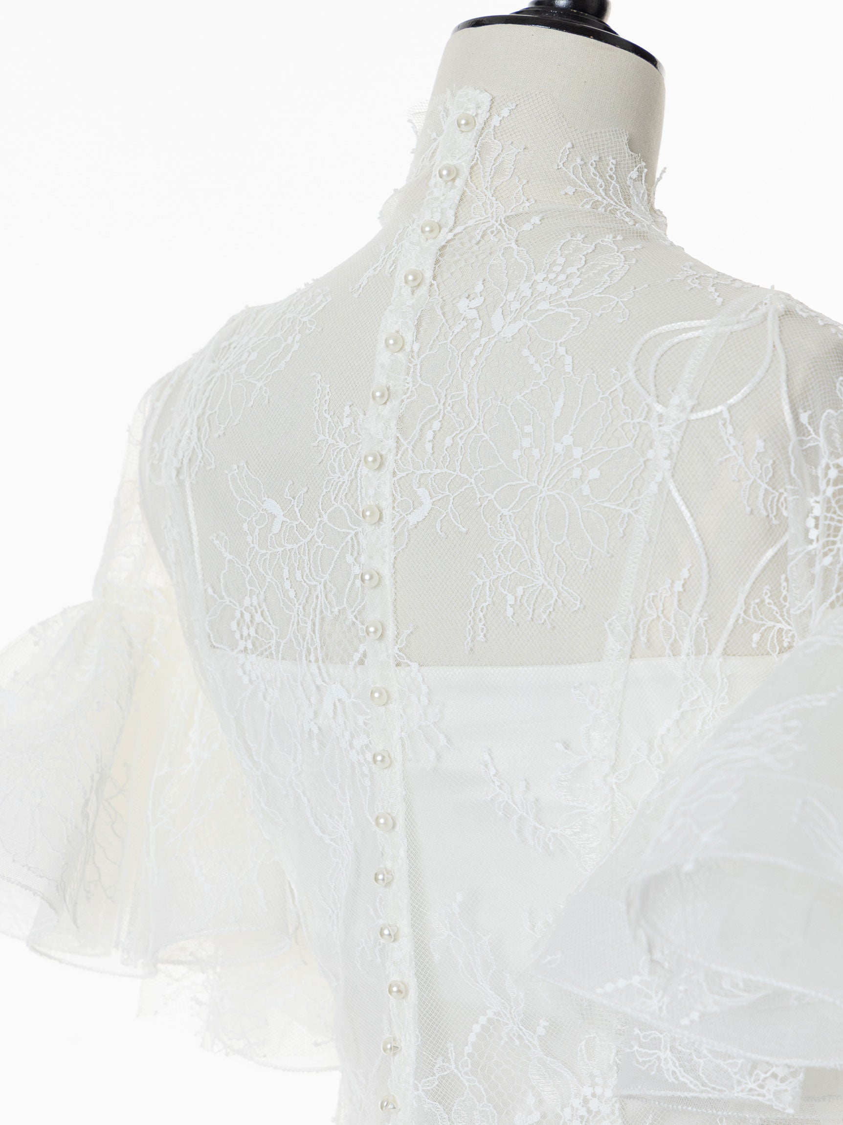 繊細なレースを用いた華やかで儚げな印象と、レースをボリューミーに重ねたドラマチックなお袖のシルエットのコンビネーションのコントラストが、意外性のもたらす優美なバランスを生み出します。