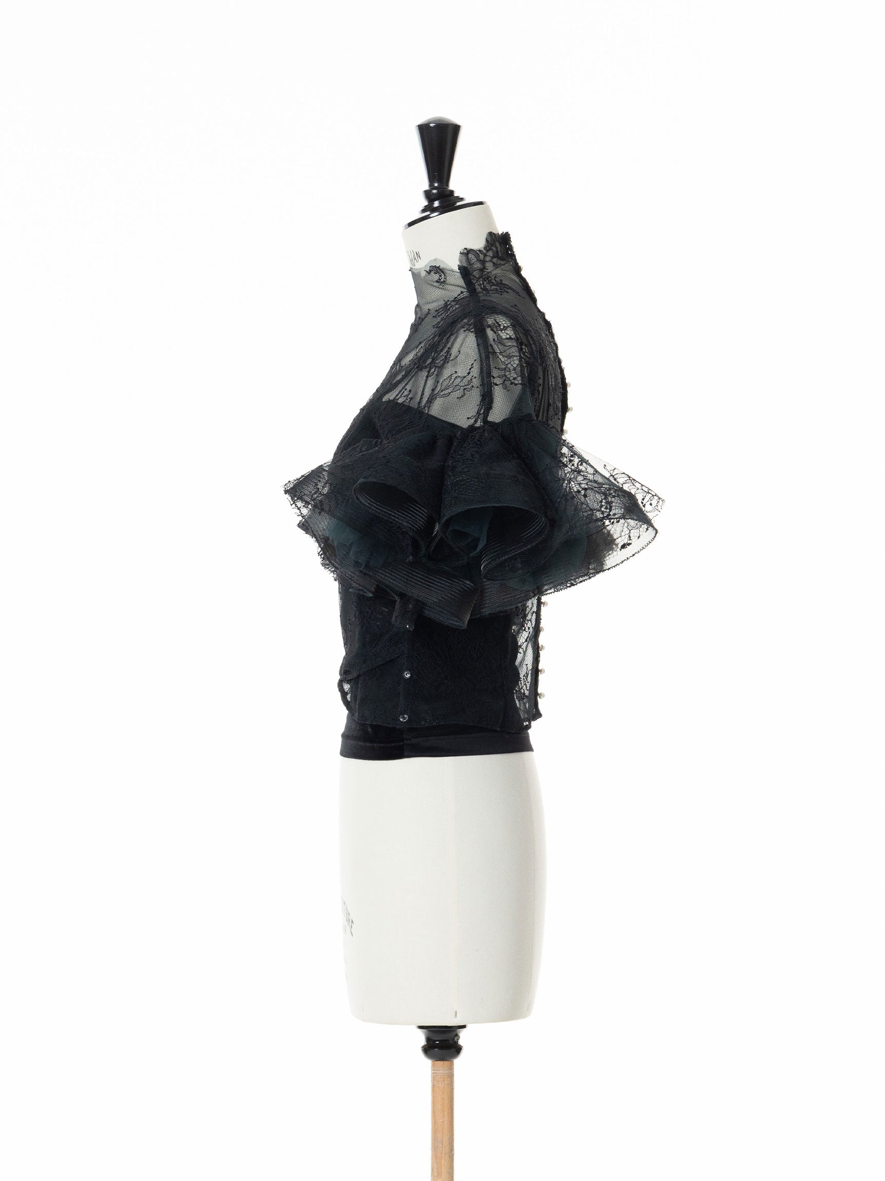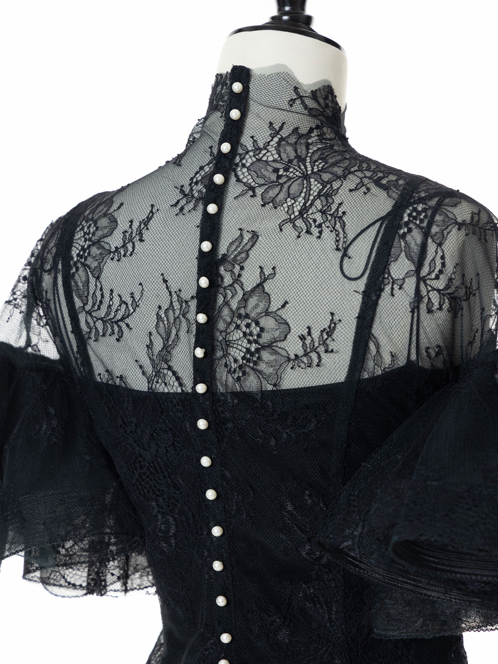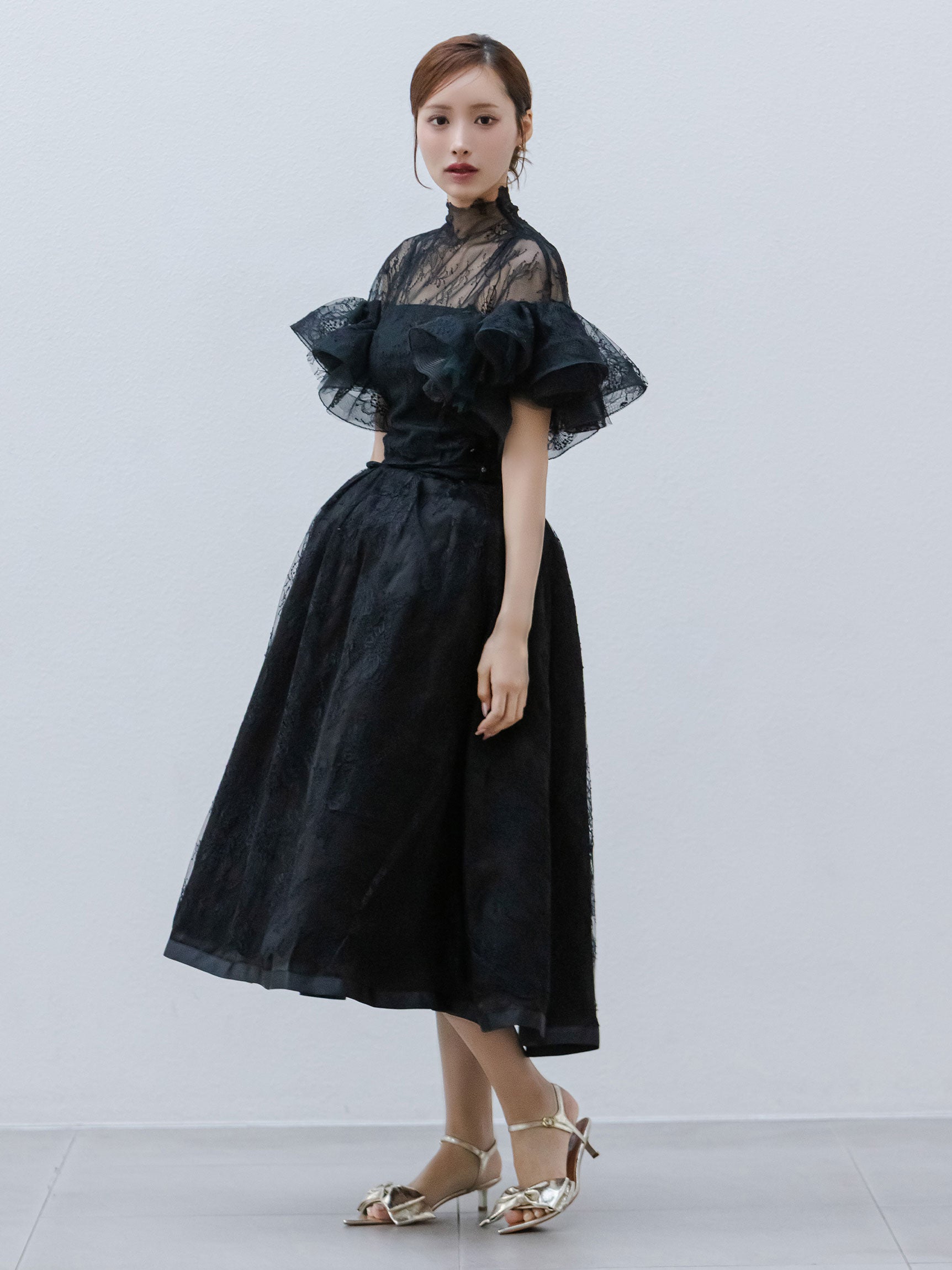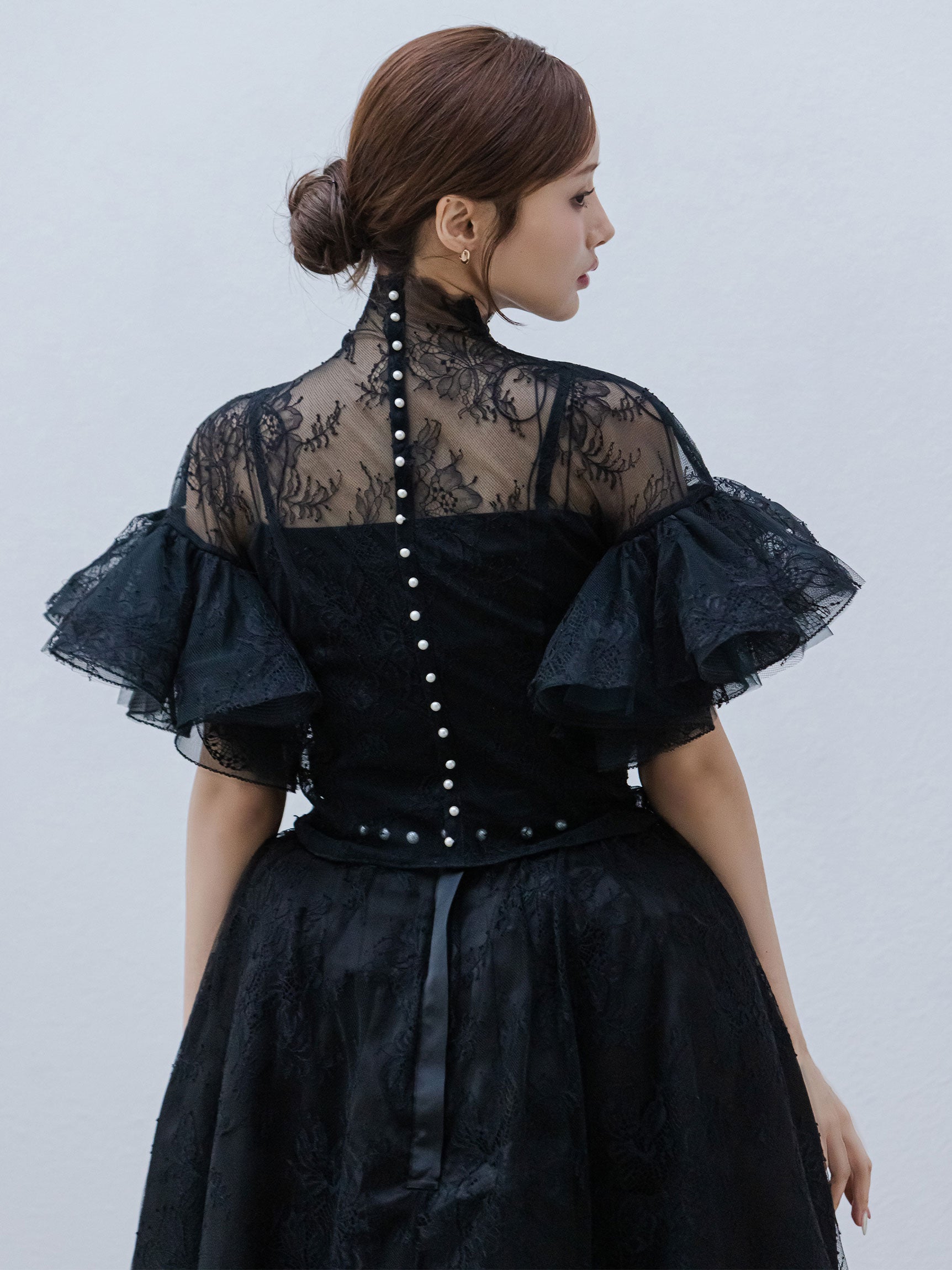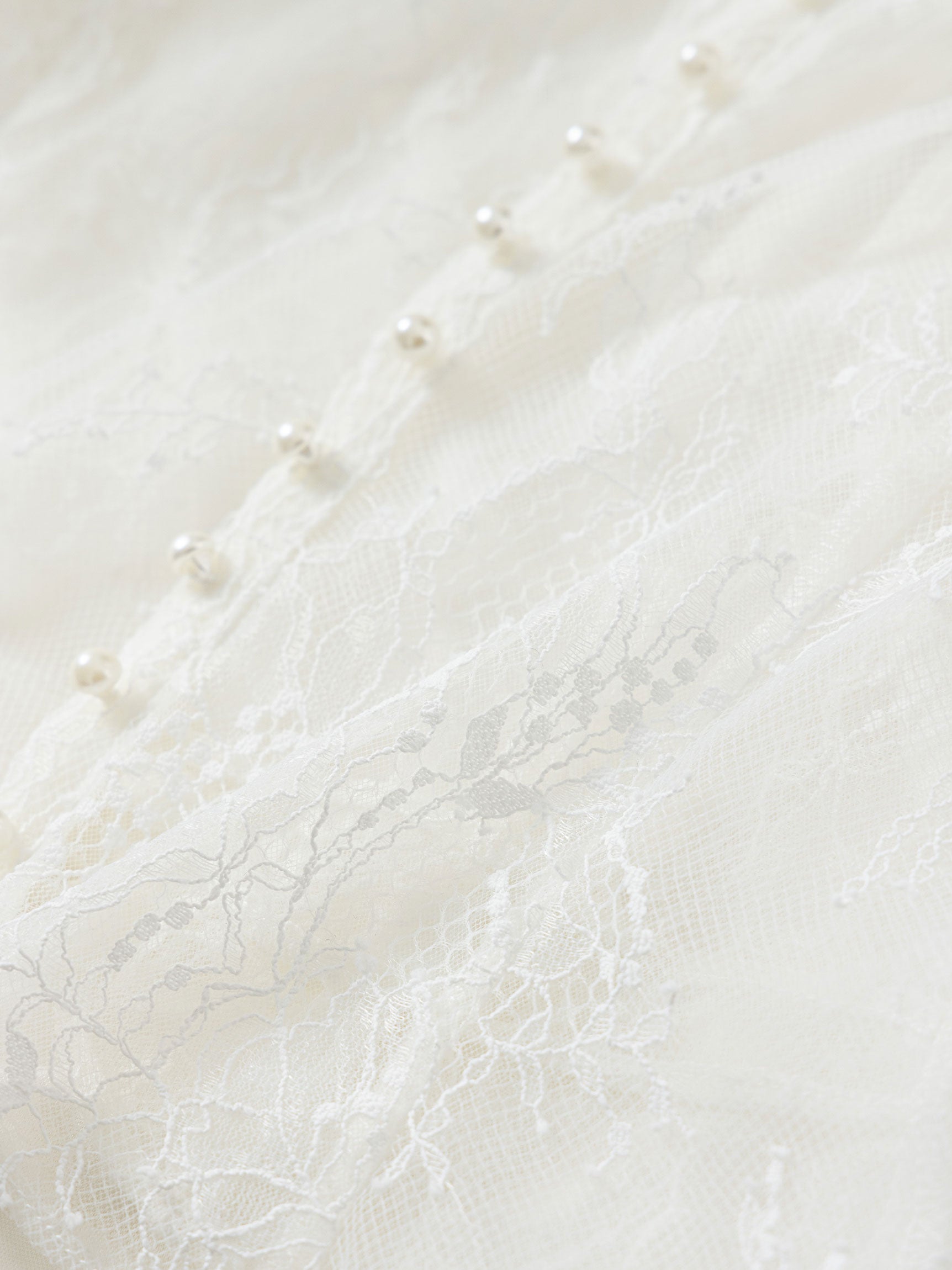繊細なレースを用いた華やかで儚げな印象と、レースをボリューミーに重ねたドラマチックなお袖のシルエットのコンビネーションのコントラストが、意外性のもたらす優美なバランスを生み出します。