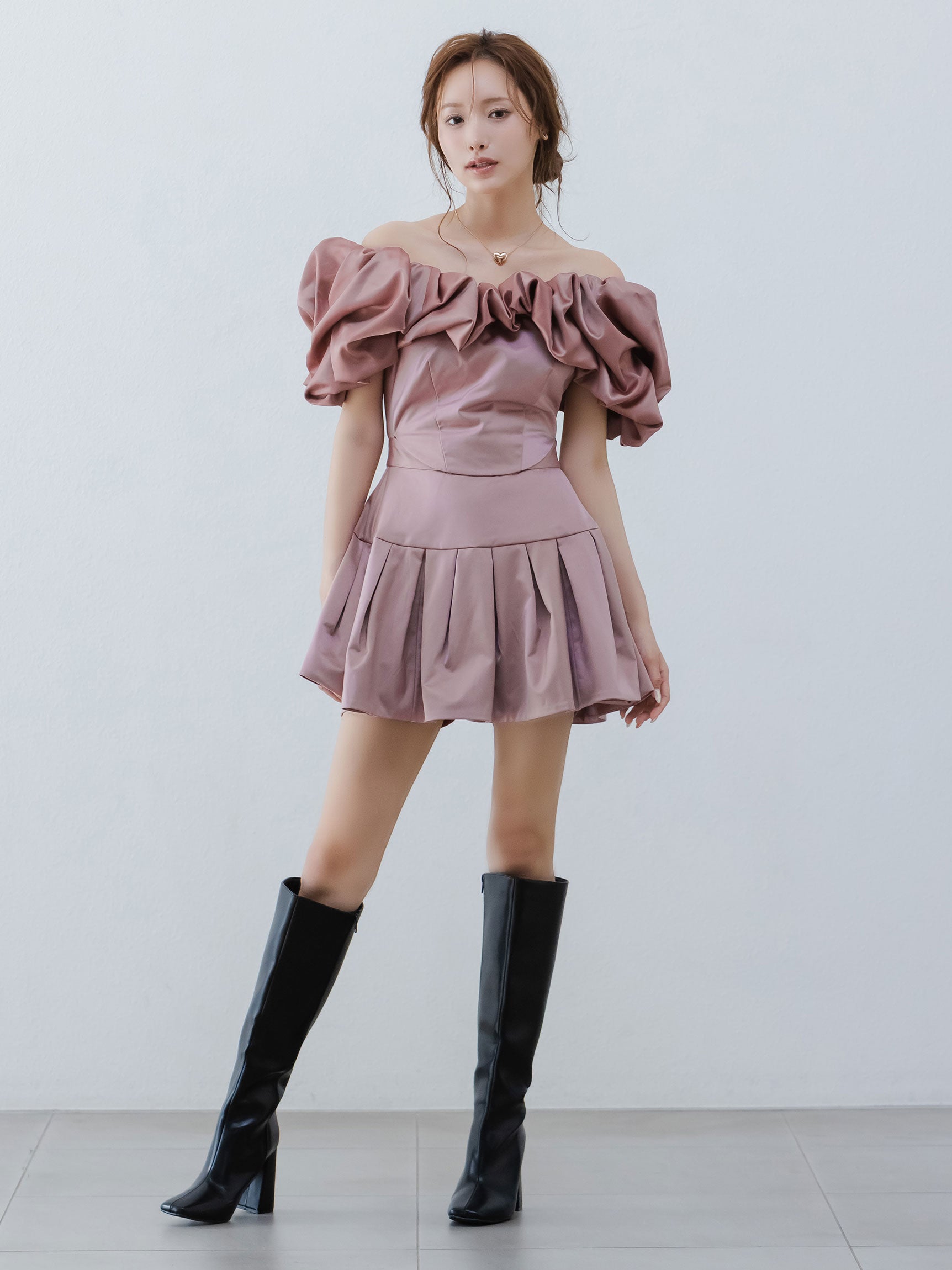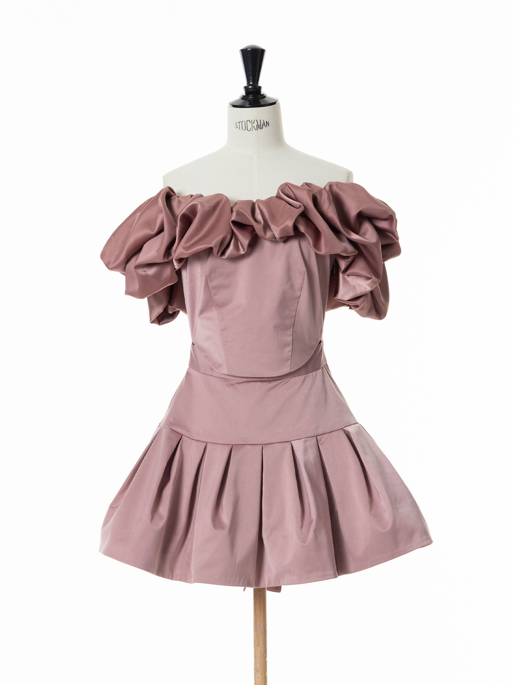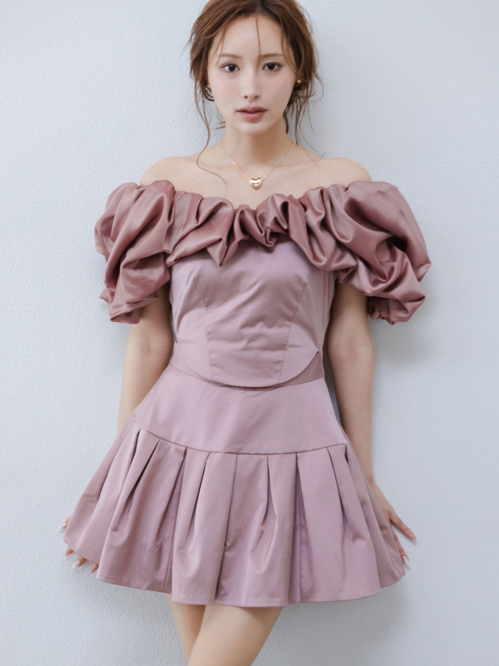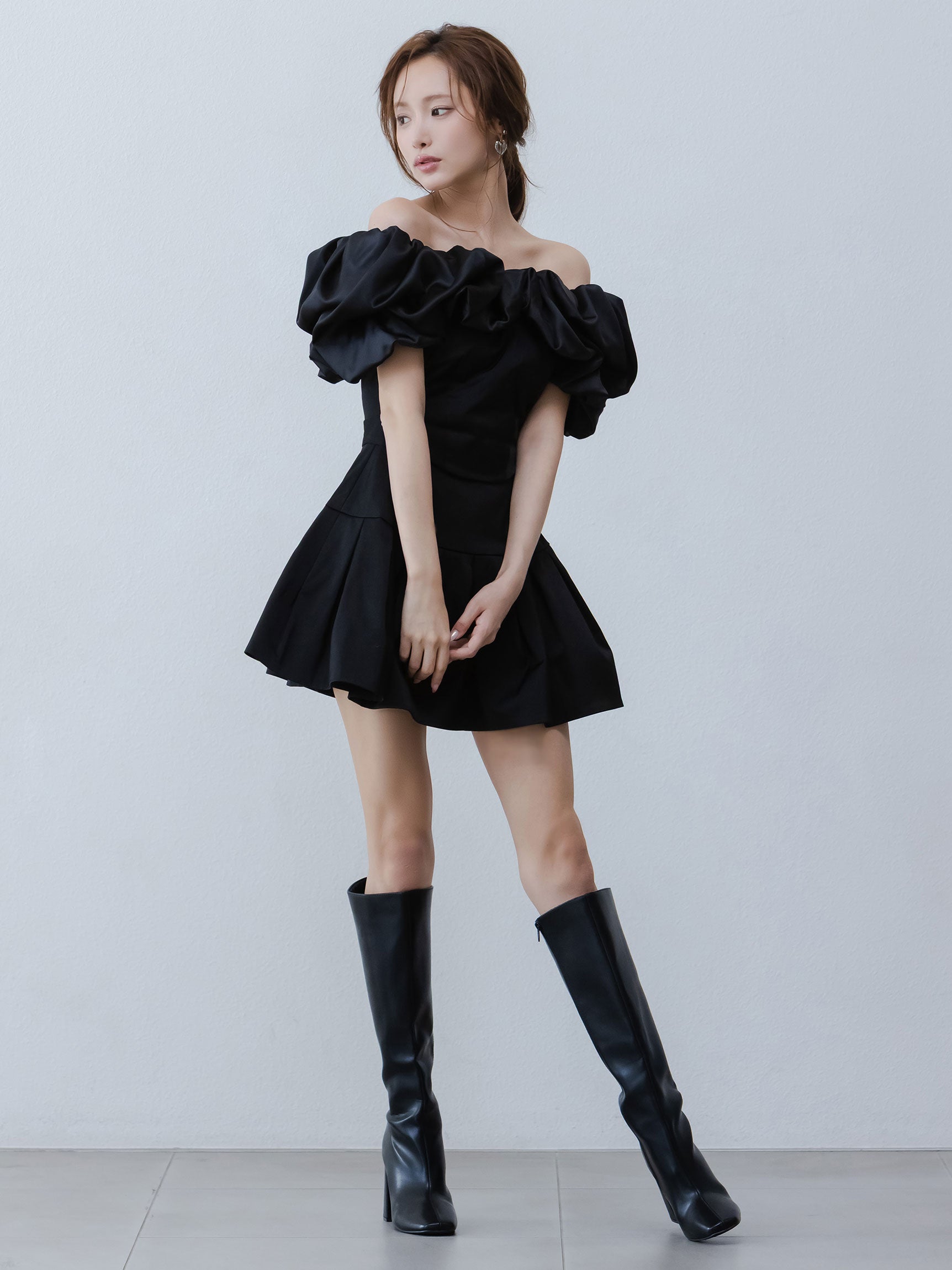ミニドレスのウエストはコルセット状にくびれたフィット感と、少し高めの腰位置から構築的に広がるスカート部分の立体感で、奥行きのあるフォルムを叶えます。
