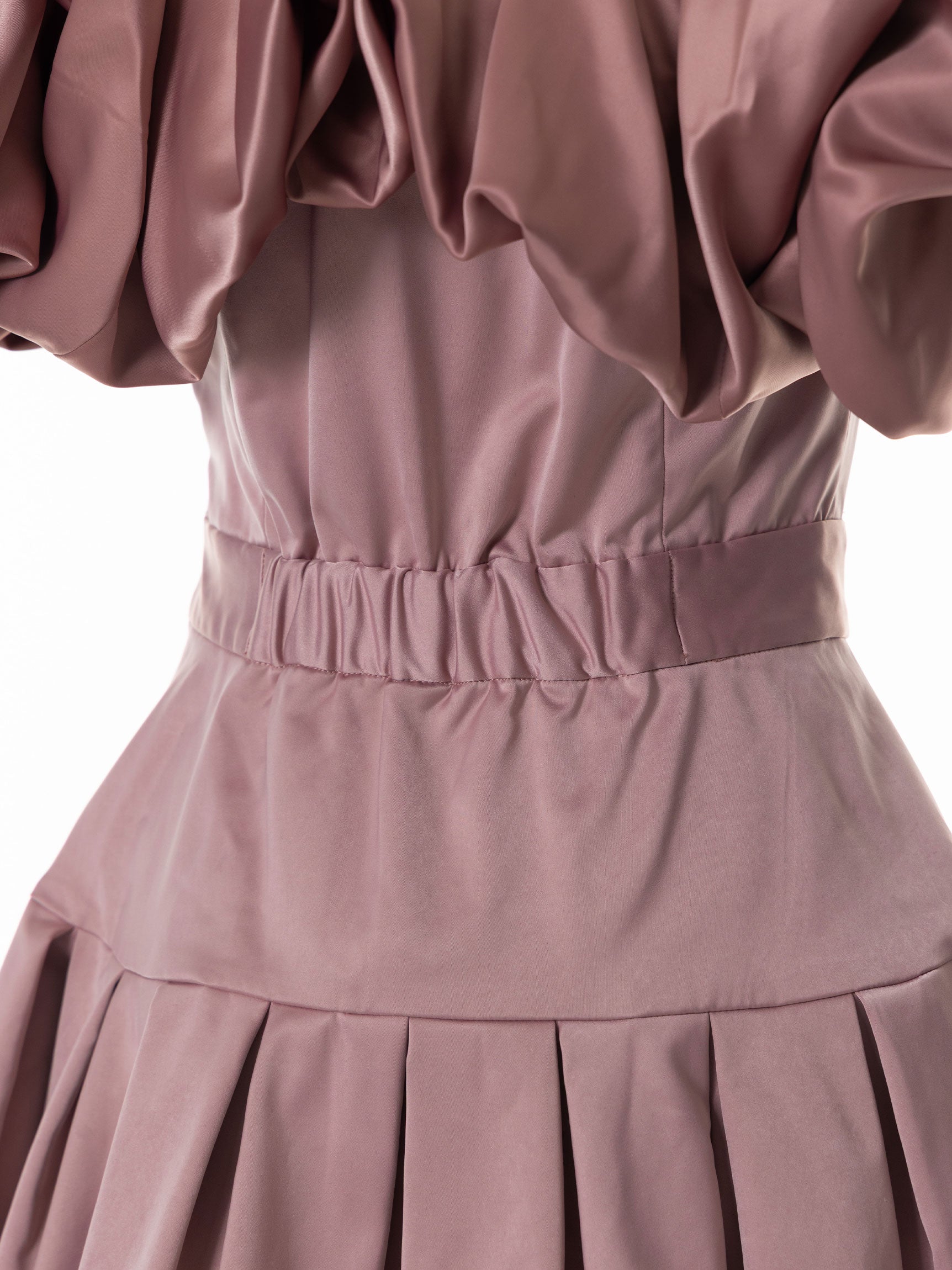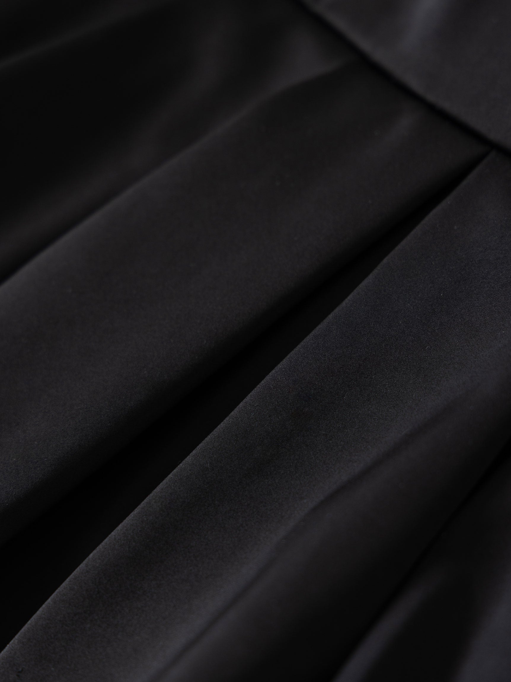 スカート部分には幾多にも折り重なるたわみを入れ、段階的にカーブしていくシルエットを構築したことで、唯一無二の華やかなフォルムを実現しました。